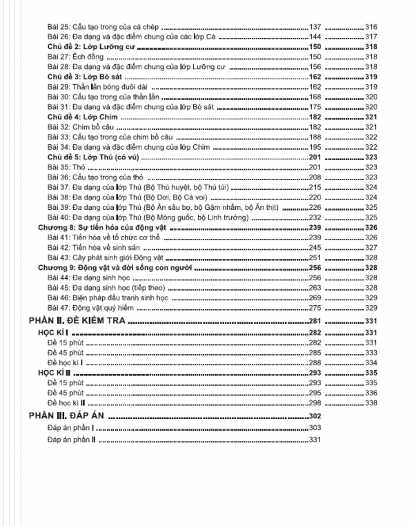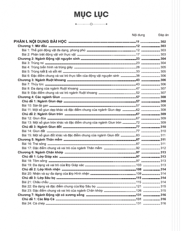 Nội dung kiến thức của môn Sinh học lớp 7 bao gồm 9 chương, mỗi chương được chia thành các chủ đề và trong mỗi chủ đề được chia thành nhiều bài học.