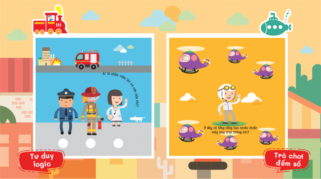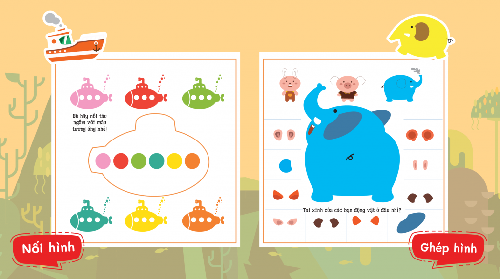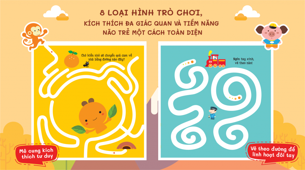 Mỗi cuốn sách có nội dung phong phú gồm 36 trang màu sắc tươi sáng, hình vẽ đáng yêu sinh động, cùng với 8 sự vật/sinh vật quen thuộc và 8 trò chơi giúp trẻ sử dụng đồng thời mắt, miệng, tay và não.