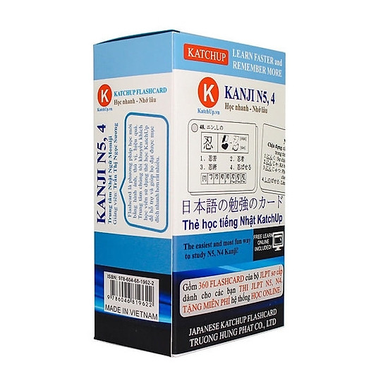 Bộ KatchUp Flashcard Hán Tự Sơ Cấp (Kanji N5,4) Kèm Học Và Thi Online gồm khoảng 360 từ Hán đơn, 1400 từ Hán ghép, được sử dụng rộng rãi trong kỳ thi JLPT N5 và N4. Đồng thời, thẻ học có kèm hình ảnh minh họa cùng với chia bộ thủ rõ ràng giúp bạn dễ dàng ghi nhớ từ Kanji. Ngoài ra, bộ Flashcard Kanji N5,4 sử dụng giấy màu xanh chất lượng ép plastic hai mặt và tặng kèm code học – thi JLPT online đựng trong hộp xinh xắn giúp bạn bảo quản Flashcard lâu hơn hoặc sang trọng khi làm quà tặng cho người thân yêu.