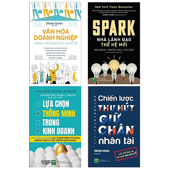 Bộ Sách Lãnh Đạo Kỷ Nguyên 4.0 (Bộ 4 Cuốn) 1. Lựa Chọn Thông Minh Trong Kinh Doanh Khi gặp phải những tình huống không mong muốn trong công việc, chúng ta thường phải đứng trước các lựa chọn khó khăn. Liệu quyết định của ta có thật sự chính xác? Liệu ta có thể đánh đổi các giá trị mình đang có để thực hiện quyết định này? Những băn khoăn và áp lực khi đứng trước các lựa chọn khiến chúng ta khó lòng thỏa mãn 100% và luôn cảm thấy “thiếu một cái gì đó”. Nhưng tại sao phải mãi lưỡng lự, đắn đo để tìm kiếm một phương án đỡ-tệ-nhất, trong khi ta có thể tự tạo ra một cách giải quyết mới và vượt trội? Chìa khóa cho vấn đề này là phương pháp tư duy tích hợp (integrative thinking), một cách hoàn toàn mới trong tư duy tạo lựa chọn được nghiên cứu, phân tích và phát triển bởi nhà tư tưởng, chiến lược gia Roger Martin. Trong cuốn sách “Lựa chọn thông minh trong kinh doanh”, Martin cộng tác với giáo sư Jennifer Riel của trường quản lí Rotman để khai thác lí thuyết và ứng dụng đa dạng hơn phương pháp tư duy này. Trong tác phẩm được tờ Wall Street Journal xếp vào danh mục Bestseller, hai tác giả sẽ dẫn dắt bạn tìm hiểu các lí thuyết căn bản nhất của tư duy tích hợp và các kiểu áp dụng của phương pháp này vào thực tế. Cuốn sách bao gồm các mô hình tư duy trực quan và những câu chuyện mới mẻ của các nhà tư tưởng. Từng chương sách đều làm sáng tỏ quá trình giải quyết vấn đề một cách sáng tạo, giúp độc giả tập luyện việc đưa ra những ý tưởng đột phá. Toàn bộ dẫn chứng trong tác phẩm đều được trích dẫn, chọn lọc từ các bài phỏng vấn trực tiếp của hai tác giả với những doanh nhân hàng đầu của các tập đoàn, tổ chức lớn như LEGO, P&G, The Vanguard … Nhà báo Malcolm Gladwell, tác giả nổi tiếng của những cuốn sách về tư duy kinh doanh như “Điểm bùng phát”, “Trong chớp mắt” – đã không tiếc lời khen ngợi “Lựa chọn thông minh trong kinh doanh”. Ông nói: “Đây là một cuốn sách kinh doanh hiếm hoi nhất có thể dạy bạn về những điều cần phải suy nghĩ để đưa ra quyết định. Một cuốn sách tuyệt vời và nguyên bản”. 2. SPARK – Nhà Lãnh Đạo Thế Hệ Mới “Không ai trong chúng ta sinh ra đã là lãnh đạo, chúng ta rèn luyện để trở thành họ.” Lãnh đạo không phải một chức vụ, mà là một công việc, một thái độ. Trong một tập thể, những người lãnh đạo có thể xuất hiện ở bất kỳ cấp bậc nào. Chúng ta gọi họ là những tia sáng (spark) – những người dám nghĩ, dám làm, dám đổi mới và có tầm ảnh hưởng lớn tới sự phát triển của các cá nhân xung quanh mình. Họ không trở thành nhà lãnh đạo chỉ nhờ vào vị trí của họ trong sơ đồ tổ chức công ty, mà bằng những hành động, cam kết gắn bó và ý chí của họ. Angie Morgan, Courtney Lynch và Sean Lynch là các tác giả đã thực hiện cuốn sách bestseller “SPARK: Nhà lãnh đạo thế hệ mới”. Trong tác phẩm, họ khẳng định những người có tiềm năng trở thành một lãnh đạo ưu tú luôn sở hữu những đặc điểm tính cách nổi bật – những hành vi khiến họ trở nên khác biệt. Các chủ đề như tính cách cá nhân, uy tín, trách nhiệm, sự tận tâm phục vụ, tự tin, nhất quá lần lượt được phân tích trong cuốn sách, có thể là những điều ai cũng đã biết, nhưng lại chưa biết cách kiểm soát sao cho thành thục. Cuốn sách này sẽ chi tiết hóa hình ảnh một vị lãnh đạo thông qua hành vi, điều mà bất kỳ cá nhân ở cấp độ nào cũng có thể áp dụng để tiến bộ và trở thành một “spark”. Nhiều chia sẻ của các tác giả – những người đã trải qua những năm tháng lãnh đạo loạn lạc nhất sẽ được tiết lộ. “SPARK: Nhà lãnh đạo thế hệ mới” là tài liệu tham khảo trung thực và đầy sức nặng. Tác giả danh tiếng Jim Kouzes khen ngợi: “Tất cả các nhà lãnh đạo đều thấy được lợi ích khi đọc và áp dụng ‘Spark’. Tôi khuyên bạn nên đọc nó ngay”. 3. Chiến Lược Thu Hút Giữ Chân Nhân Tài Một trong những lợi thế cạnh tranh giữa các công ty ngày nay chính là nguồn nhân lực sáng tạo, có tư duy phản biện và dám nghĩ dám làm. Chọn đúng nhân viên tài năng là yếu tố then chốt để đưa doanh nghiệp đi đến thành công. Tuy nhiên, để công ty được bền vững, lâu dài và công ty ngày càng phát triển thì người lãnh đạo không những phải thu hút được nhân tài mà còn nên biết giữ chân họ. “Chiến lược thu hút giữ chân nhân tài” dựa trên tâm lý học Adler sẽ cho bạn biết cách để lôi kéo, giữ chân nhân tài về công ty. Quan trọng hơn tất cả là bạn cần biết cách nắm bắt tâm lý con người. 4. Văn Hóa Doanh Nghiệp Trong Thời Đại Công Nghệ Số Ngày nay, văn hóa doanh nghiệp không chỉ là một lĩnh vực đặc thù của ngành nhân sự nữa, mà đã trở thành nền tảng cơ bản của mọi công ty. Bất kỳ một nhà quản lý nào muốn tổ chức của mình phát triển bền vững cũng cần phải đầu tư v