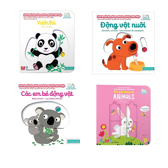 Combo 4 quyển Sách chuyển động – Song ngữ A-V: Các động vật nhỏ bé + Các em bé động vật + Động vật nuôi + Vườn thú"Xuất…