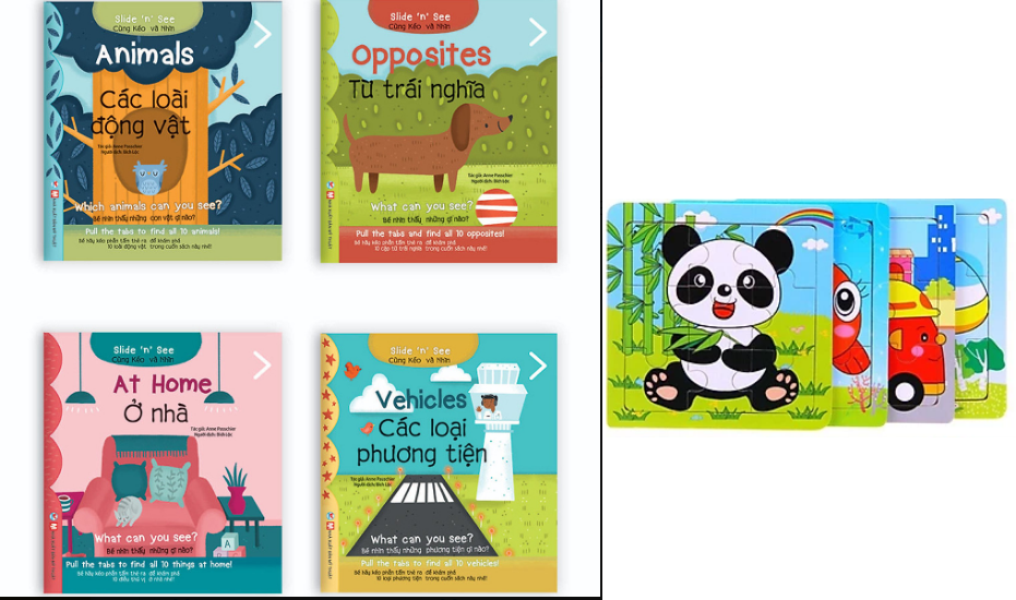 Combo 4 cuốn Sách tương tác Song ngữ – Slide and see cho bé học Tiếng Anh: At home, Animals, Opposites và Vehicles…