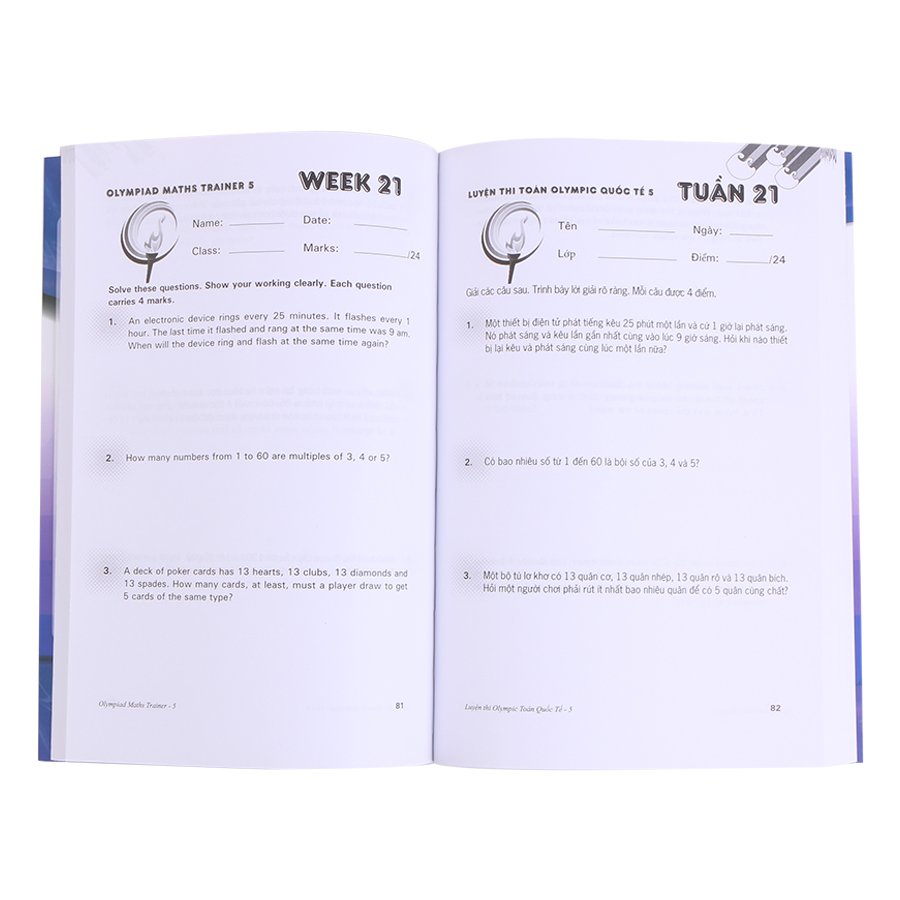 Sách : Luyện Thi Olympic Toán Quốc Tế – Dành Cho Độ Tuổi 10-13 tuổi ( Song Ngữ Anh – Việt )Cuốn luyện thi Olympic toán quốc tế với các dạng bài tập như: – Hoán vị , Tổ hợp, Bài toán về sự dư thừa và …