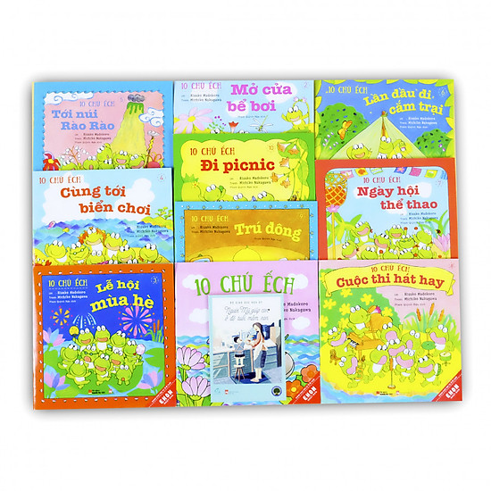 Series Ehon Nhật Bản – 10 Chú Ếch gồm 10 truyện khác nhau xoay quanh những câu chuyện thú vị về 10 chú ếch tinh nghịch, đáng yêu với những tình huống trong cuộc sống hàng ngày. Đây được coi là một trong những bộ truyện Ehon Nhật Bản hay nhất về chủ đề động vật. Với tạo hình chú ếch ngộ nghĩnh, màu sắc truyện tươi sáng, đẹp mắt, cùng với những tình huống gần gũi trong cuộc sống hàng ngày về tình cảm trong gia đình, lòng dũng cảm vượt qua khó khăn, tình đoàn kết, sự tự tin thể hiện bản thân…ắc chắn sẽ đem tới cho các em nhỏ những câu chuyện vô cùng thú vị. Bộ sách bao gồm 10 cuốn: – 10 chú ếch đi picnic – Lần đầu đi cắm trại – Cuộc thi hát hay – Ngày hội thể thao – 10 chú ếch trú đông – Lễ hội mùa hè – Mở cửa bể bơi – 10 chú ếch – 10 chú ếch tới núi rào rào – Cùng tới biển chơi