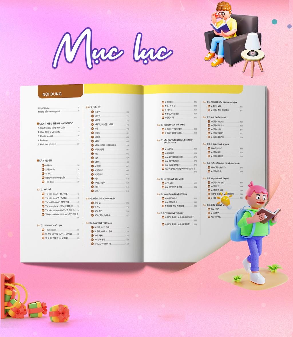 Sách gồm có 3 phần chính tổng hợp các kiến thức chính về ngữ pháp tiếng Hàn sơ cấp và thêm nhiều phần kiến thức liên quan: