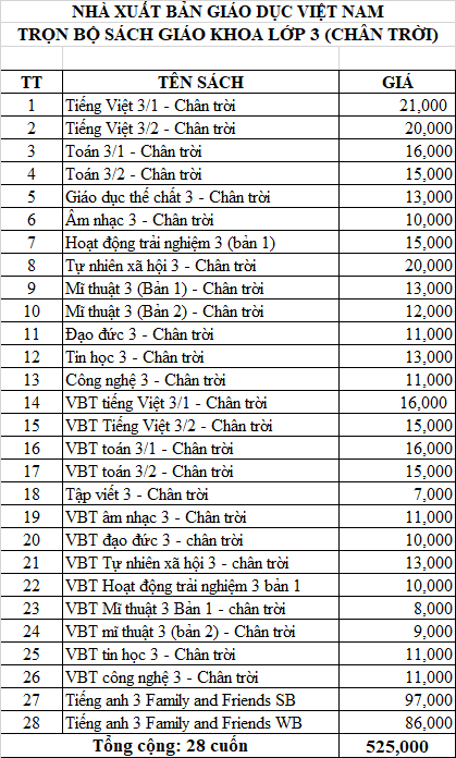 NHÀ XUẤT BẢN GIÁO DỤC VIỆT NAM TRỌN BỘ SÁCH GIÁO KHOA LỚP 3 (CHÂN TRỜI) TTTÊN SÁCHGIÁ1Tiếng Việt 3/1 – Chân trời 21,0002Tiếng Việt 3/2 – Chân trời20,0003…
