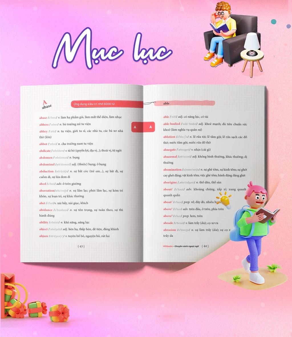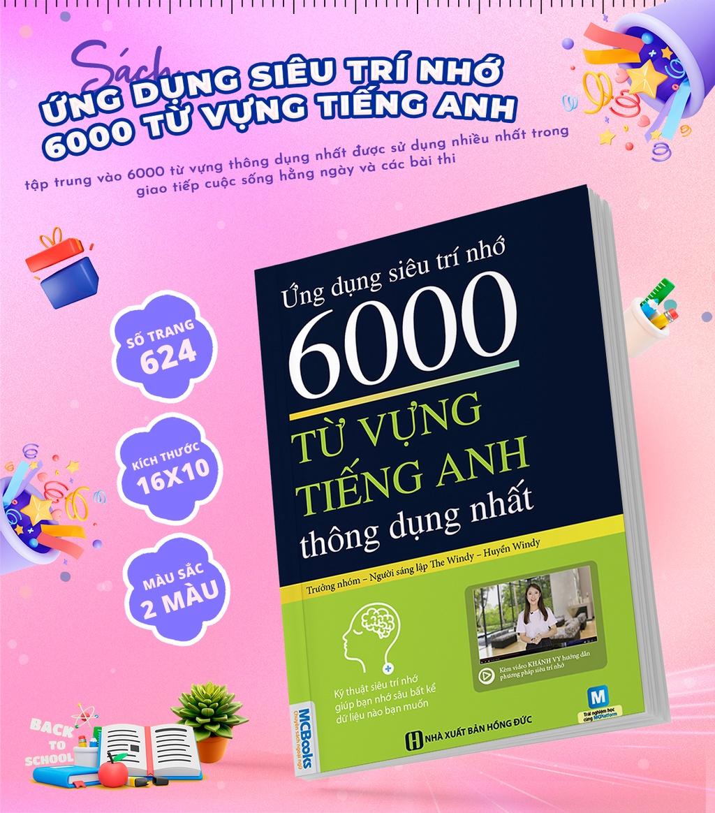 Cuốn sách “Ứng dụng siêu trí nhớ 6000 từ vựng tiếng Anh thông dụng nhất” tập trung vào 6000 từ vựng thông dụng nhất được sử dụng nhiều nhất trong giao tiếp cuộc sống hằng ngày và các bài thi nhằm tăng cường khả năng ghi nhớ tối ưu tiềm năng của não bộ để áp dụng vào giao tiếp thực tế